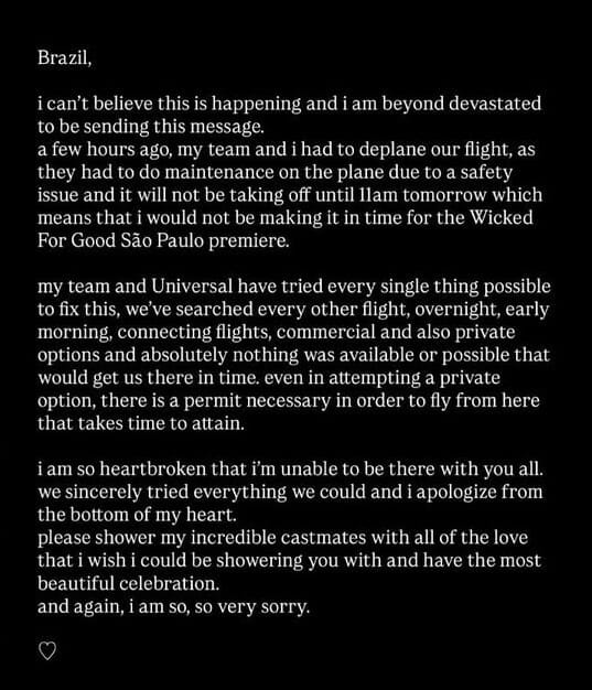 In a statement shared on Instagram, Grande wrote that she was “beyond devastated” to miss the event, explaining that she had worked up until the last minute on another film and had no earlier travel window. “We’ve searched every other flight, overnight, early morning, connecting flights, commercial, and also private options, and absolutely nothing was available,” she said. “Even in attempting a private option, there is a permit necessary in order to fly from here that takes time to attain.”